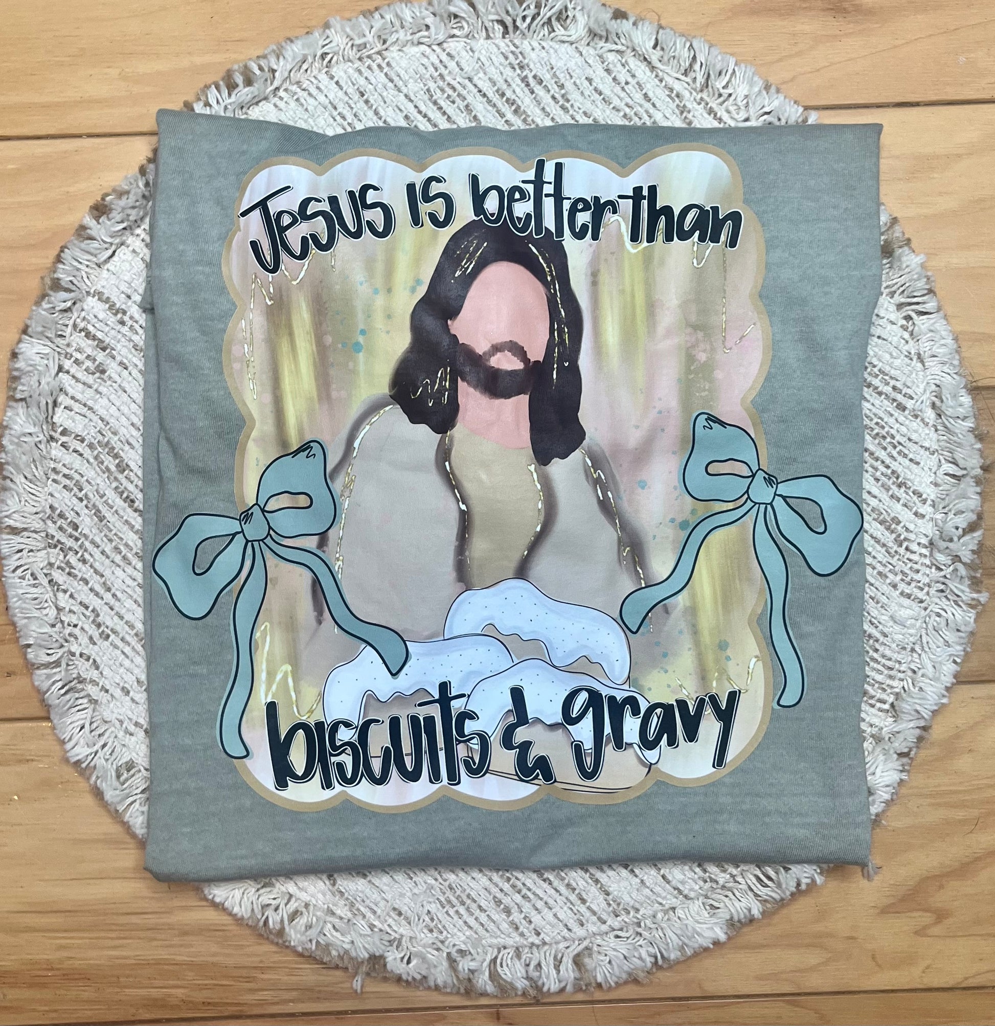 Our Biscuits & Gravy tee adds a playful twist to your wardrobe. With a front bow design and comfort color tee, you'll love the comfort and style it brings. Plus, with the witty "Jesus is better than biscuits and gravy" message, you'll show your unique sense of humor.
