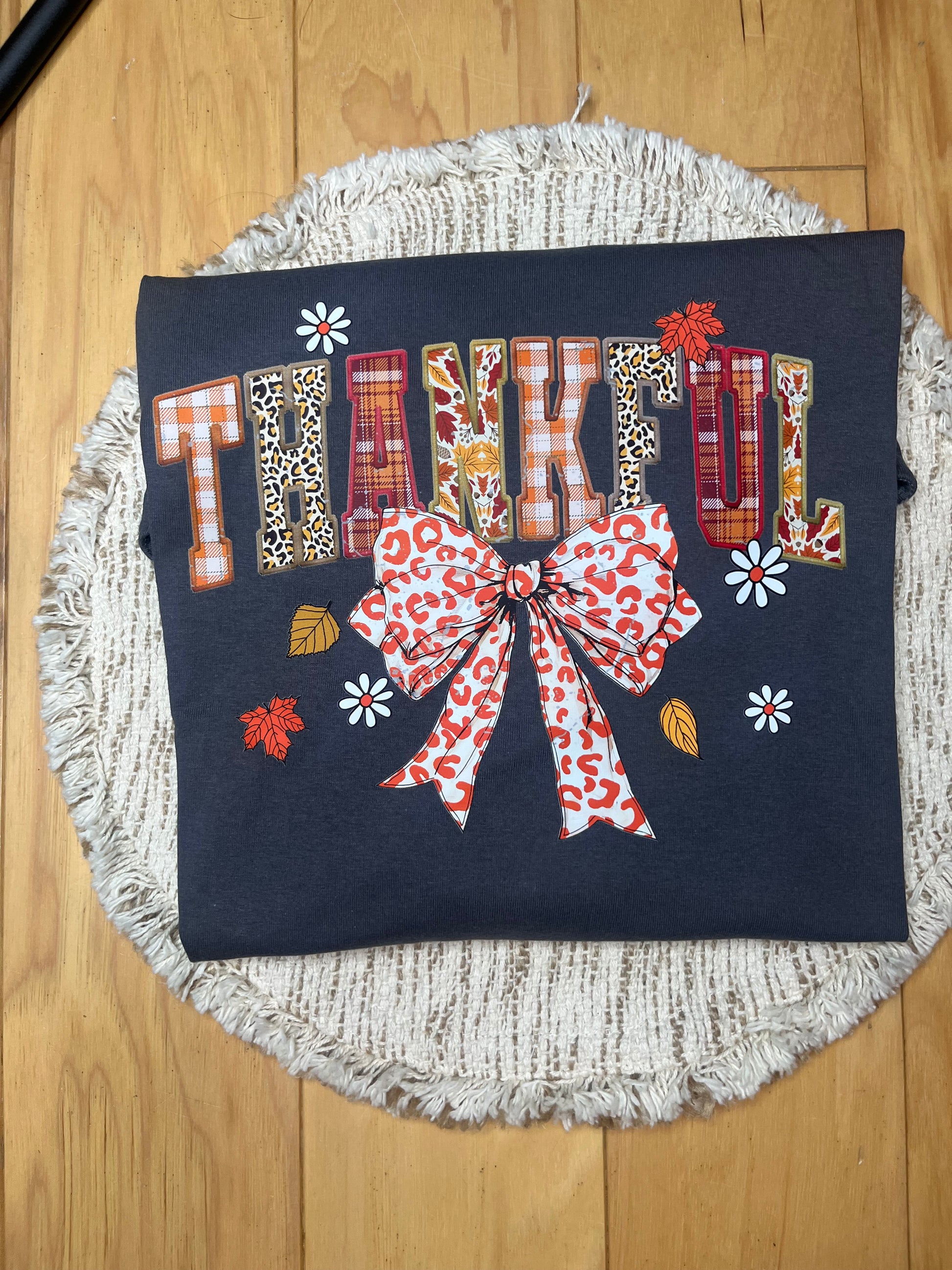 This Thankful long sleeve tee is perfect for showing off your favorite things! With a playful bow and a fall pattern, you'll be stylish and comfortable all season long. Stay grateful (and stylish) in this quirky and fun tee.